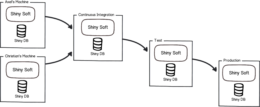 데이터 마이그레이션이 필요한 이유는 프로젝트를 진행할때 위 그림처럼 여러 환경에서 데이터베이스가 존재한다.