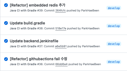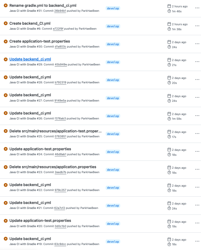 이후 workflow에 mysql관련 설정들과 application.properteis생성해주는 설정을 빼주고 다시 ci테스트를 해봤더니..