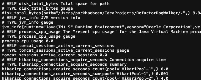추가하게 되면 prometheus라는 엔드포인트가 노출된다. 해당 포인트로 들어가보면 밑밑 그림처럼 수집해갈 메트릭정보들이 나온다.