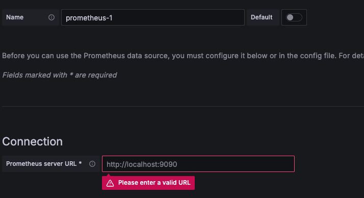 이후 Prometheus URL를 입력하고 (name은 맘대로) 하단에 save & test를 클릭하여 저장한다. (클릭시 실패 혹은 성공이 뜬다.)