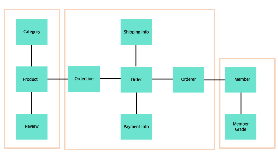 이렇게 애그리거트 단위로 하나의 군으로 묶으면 좀더 상위 수준에서 도메인 모델간의 관계를 파악할 수 있다