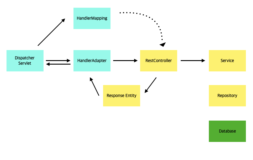 이후 요청을 컨트롤러로 위임할 핸들러 어댑터를 찾아서 전달(핸들러 어댑터가 컨트롤러로 요청을 위임함)